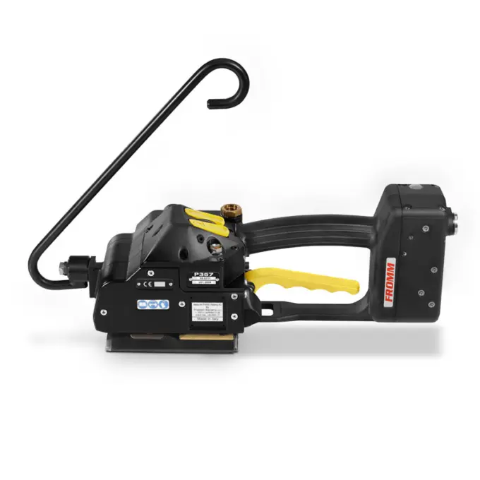 FROMM P357 este un dispozitiv pneumatic fiabil și versatil pentru legare cu bandă plastică în aplicații industriale. Construcția bine echilibrată și dispunerea ergonomică a comenzilor permit operarea cu o singură mână, chiar și în ritm de lucru intens. Procedura de introducere a benzii este simplificată, cele două benzi fiind poziționate simultan pentru un ciclu rapid și constant.